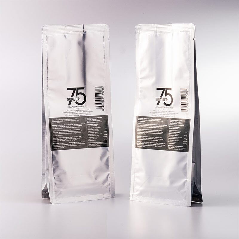 No75 Kollageeni nivelille tuotesarja on valmistettu Suomessa puhtaista ja turvallisista raaka-aineista. Tuotteemme sisältävät ainoastaan luonnollisia ainesosia: patentoitua ja biologisesti aktiivista hydrolysoitua kollageenia, glukosamiinia, kondroitiinisulfaattia, C-vitamiinia ja hyaluronihappoa. Ei lisättyä sokeria eikä lisäaineita.