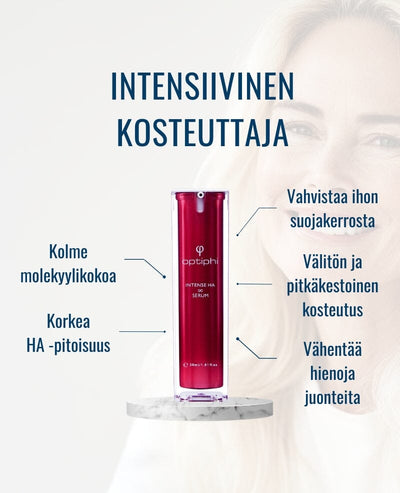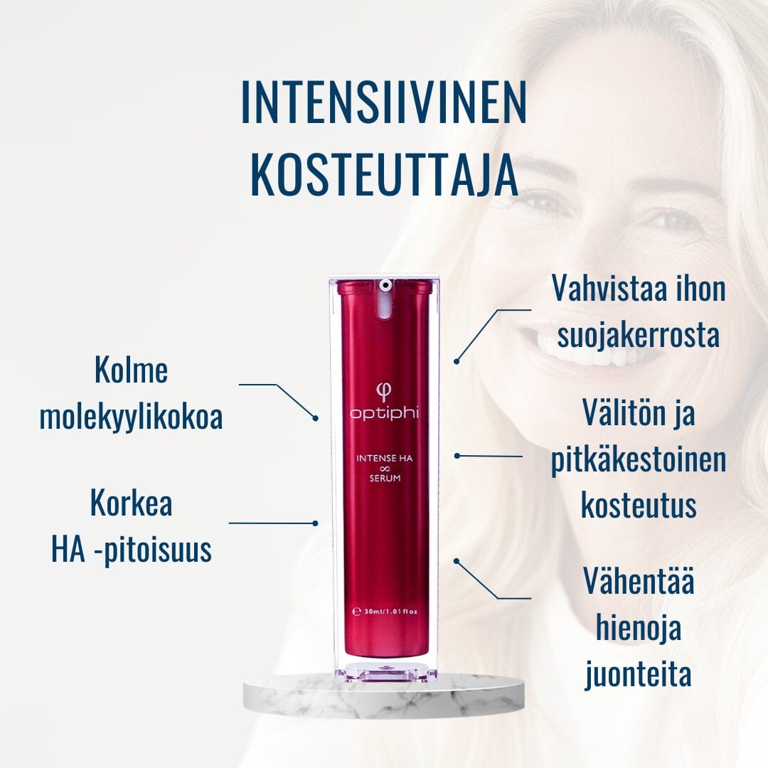 Kiitos Elina paljon palautteestasi! On ilo kuulla, että Optiphi Intense HA Serum on tuonut näkyviä tuloksia ja olet tyytyväinen tuotteeseen. Myös monet muut asiakkaamme ovat kehuneet seerumin tehokasta ja pitkäkestoista kosteutusta sekä sen tuomaa ihon kirkastumista ja juonteiden silottumista.