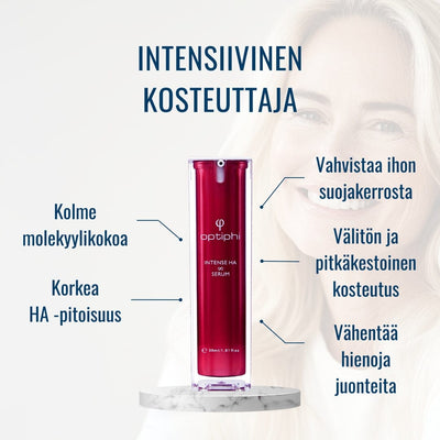 Levitä Intense HA Serum optiphi® Revitalizerin tai Active Gelien päälle ja Control Creamien alle. Anna tuotteen imeytyä kunnolla ennen muiden tuotteiden levittämistä. Voidaan käyttää aamuisin ja iltaisin.